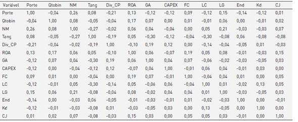 A correlação negativa entre Tangibilidade e NM (-0,27) e Custo da Dívida e NM (-0,03) respaldam as evidências teóricas, visto que empresas com menores níveis de governança e, em tese, mais restritas podem utilizar ativos tangíveis para proporcionar garantias e captar mais recursos externos, bem como possuir maior custo de dívida. Ressalta-se que as correlações entre as variáveis independentes foram baixas (valores menores que 0,4) o que reduz o efeito da multicolinearidade.