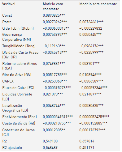 Todas as variáveis do modelo empírico apresentaram significância estatística ao nível de 99%, exceto as variáveis as variáveis Q Tobin e CJ apesar de significativas ao nível de 95% no modelo com a constante, quando retirada o Q Tobin deixa de ser significativa e o CJ passa a ser significativo em 99%.