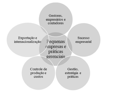 Na sexta etapa, foram coletados todos os artigos da nossa amostra que totalizaram 140 e foram excluídos 60 de acordo com os métodos estabelecidos, resultando em um total de 80 artigos utilizados. Na sétima etapa, foi elaborada uma planilha no Excel, onde foram elaborados os resumos de cada artigo selecionado no final da sexta etapa (como por exemplo: metodologia, amostra, objetivo). Por fim, tem-se a oitava etapa, que se configurou na identificação das semelhanças temáticas entre os artigos, sendo formados 5 eixos: gestores, empresários e contadores; controle de produção e custos; sucesso empresarial; gestão, estratégia e práticas; e, exportação e internacionalização. Os eixos encontrados podem ser visualizados na figura 2.