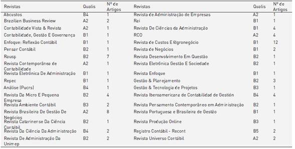 Cabe ainda ressaltar que a revista Análise (Pontifícia Universidade Católica do Rio Grande do Sul - PUCRS) não está mais classificada entre os periódicos de Administração, mas optou-se por permanecer com o seu artigo, visto que no momento da seleção das revistas, a mesma se en quadrava no critério estabelecido.