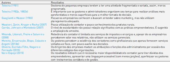 Um eixo temático encontrado foi o relacionado às análises, sendo utilizados como principal objeto de estudo o perfil dos gestores, empresários e contadores nas pequenas empresas. Os principais resultados desses artigos são encontrados na tabela 2.