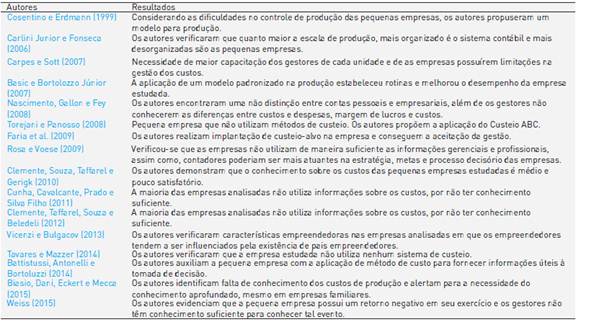 Em todos os artigos encontrados, é possível observar uma reafirmação do limitado conhecimento e a aplicação das ferramentas relacionadas aos custos. Por vezes, os motivos para acontecimento de tal fato seja a interação familiar (Biasio, Dani, Eckert e Mecca, 2015), ou mesmo a falta de atendimento a um princípio básico da contabilidade, a entidade (Nascimento, Gallon e Fey, 2008).