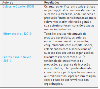 Outro grupo detectado, a partir da análise, refere-se ao sucesso empresarial. Apesar de esse tema estar relacionado de alguma forma com os demais subtópicos, os artigos encontrados são facilmente identificados como artigos voltados ao entendimento da manutenção e sucesso das pequenas empresas no mercado (tabela 4).