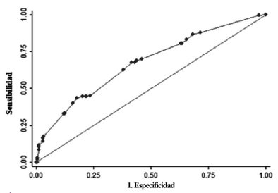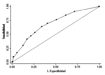 En complemento con los valores correctamente clasificados, la curva ROC (figura 1) muestra la exactitud de la prueba, relacionando la especificidad y sensibilidad del modelo; por lo tanto, la curva contrasta la probabilidad de clasificar correctamente a un estudiante de maestría con IE dados unos regresores frente a uno cuyo estado es definido como negativo. En síntesis, la curva ROC proporciona una representación global de la exactitud del modelo; así, dada el área bajo la curva ROC, el modelo para el grupo de factores demográficos está en capacidad de discernir en un 69% entre los estudiantes con (y sin) IE.