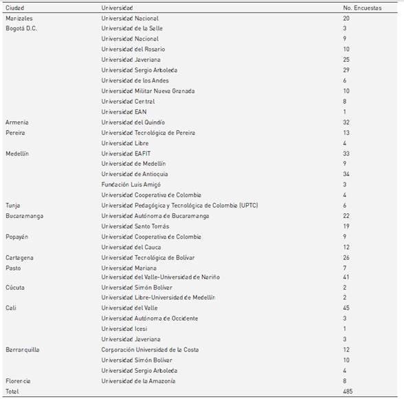 En este sentido, el estudio se realiza con los estudiantes de los programas presenciales de MBA en Colombia; de un total de 54 maestrías ubicadas en 15 ciudades del país en 2016, se obtuvo información de los estudiantes de 36 programas ubicados en 14 ciudades. La información fue reco lectada durante el primer semestre de 2016 a través de la página www.encuestafacil.com; en total se obtuvieron 532 encuestas de las cuales 485 fueron válidas (tabla 1).