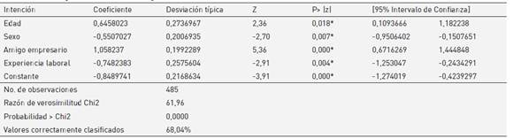 De otra parte, la razón de verosimilitud Chi2 (45,65) (tabla 3) para los componentes familiares expresa que las variables familiar empresario y tener padres empresarios son estadísticamente significativas en el modelo, lo anterior implica rechazar hipótesis de coeficientes iguales a cero; no obstante, el p-valor muestra que la formación académica del padre (universitario) y la madre (universitario) presentan probabilidades del 21% y 29%, respectivamente, de tener coeficientes iguales a cero; es decir, no son estadísticamente significativas. Al respecto, las variables se sostienen en los modelos respaldados por la evidencia teórica.