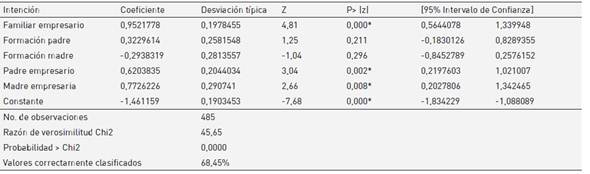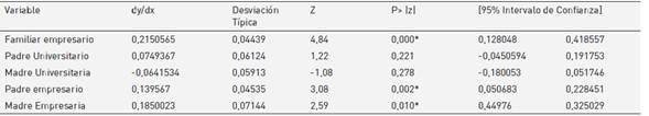 De otro modo, se estiman los cambios marginales en el Logit para el grupo de variables relacionadas con la estructura familiar del estudiante; entre ellas, la presencia de familiares empresarios, la ocupación del padre, la ocupación de la madre y la formación académica de los mismos. Para los fines propuestos se emplean técnicas de estadística inferencial a través de un modelo Logit, que es definido dado que los coeficientes de regresión expresan el cambio en el logaritmo de las probabilidades, cuando una de las variables explicativas cambia en una unidad, permaneciendo constantes las demás.