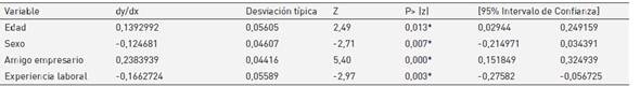 De otra parte, en un rango de edad menor a los 30 años, la probabilidad de sentir estímulos para emprender aumenta en 13 puntos porcentuales; así, no existe evidencia estadística para rechazar la hipótesis 2. No obstante, en relación con la muestra analizada, la restricción de rango en la variable de edad podría haber disminuido artificialmente la correlación observada en este estudio.