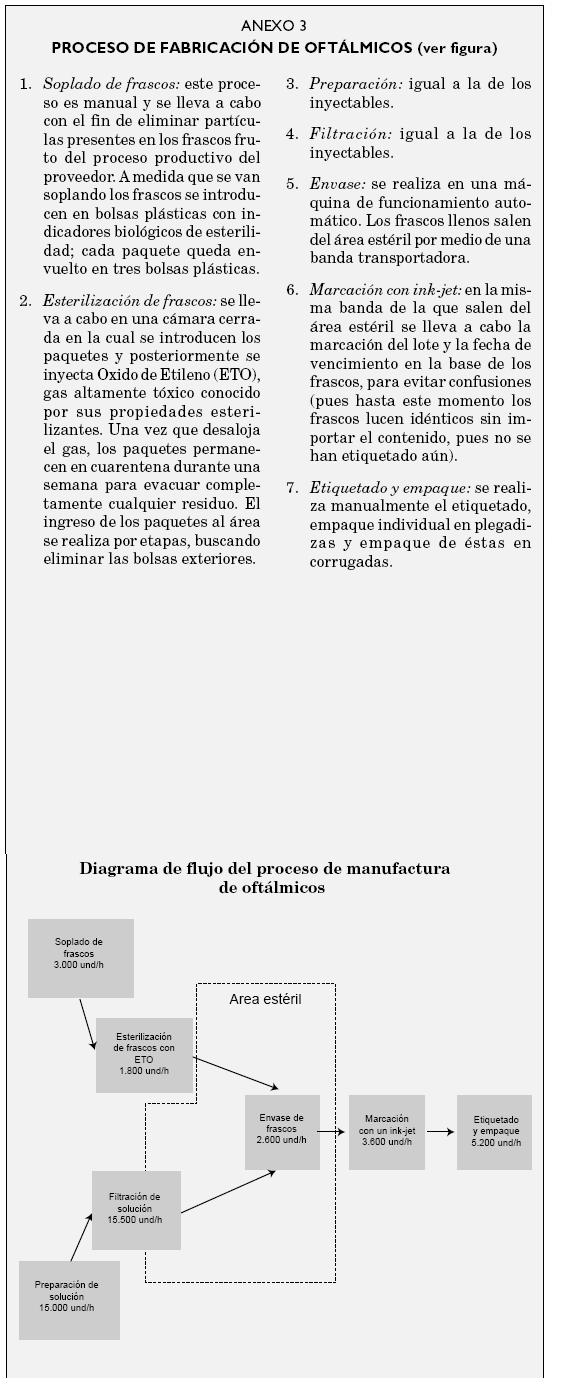 "Está bien, Andrés, ahora explícame el proceso productivo de estos medicamentos", le dijo Natalia a su colega. "Muy bien, señorita, se ve que usted quiere aprender, así que ponga atención. La planta tiene dos máquinas envasadoras alrededor de las cuales gira todo el proceso: la de inyectables y la de oftálmicos; cada una está en cuartos separados, pero en la misma área estéril. Veamos por separado los dos procesos productivos; la fabricación de inyectables consta de las operaciones de lavado de ampollas, esterilización de ampollas, en paralelo fabricación de la solución y filtración de la solución, luego envase de la solución en las ampollas, revisión óptica de las ampollas, prueba de sellado de las mismas y empaque (ver Anexo 2); por su parte para los oftálmicos, se fabrica y filtra la solución de la misma manera que para los inyectables y en paralelo se esterilizan con óxido de Etileno (E.T.O.) los frascos y se pasa al envase de la solución, su marcación con ink-jet, etiquetado y empaque final" (ver Anexo 3).