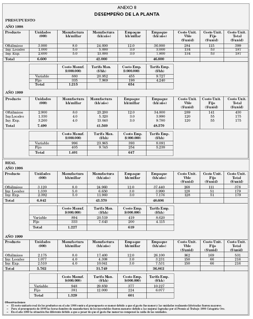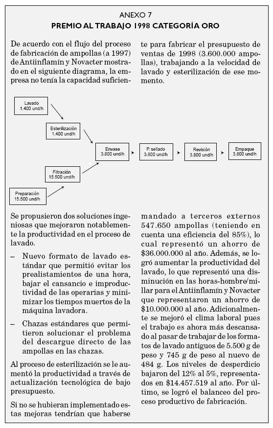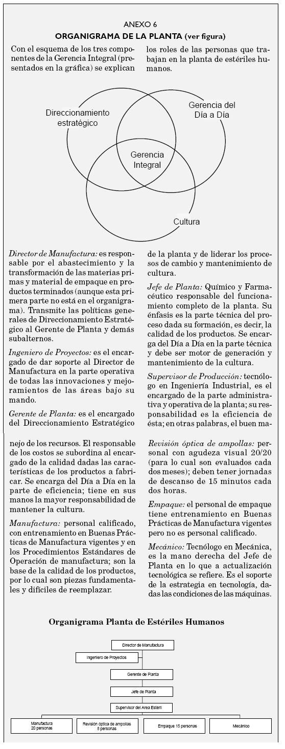 Ante la negativa de Natalia, Andrés continuó: "Bueno, entonces pasemos ahora al funcionamiento administrativo. Para empezar, te cuento que trabaja nueve horas diarias cinco días a la semana. Veamos el organigrama" (ver Anexo 6). "Una de las características relevantes de esta estructura es que mantiene un balance entre lo técnico y lo administrativo a través del jefe del área (químico farmacéutico de profesión) y el supervisor de producción (tecnólogo en Ingeniería Industrial), respectivamente. Por otra parte, es importante saber que los operarios de manufactura son mano de obra calificada, a diferencia del personal de empaque -explicó Andrés a Natalia sobre la gráfica-. Por otra parte, Natalia, me parece bueno que sepas que el mecánico del área recibió el Premio al Trabajo 1998 Categoría Oro gracias a sus aportes al balanceo de la línea productiva de inyectables estériles, a través de mejoramientos graduales que han generado cultura de mejoramiento continuo; él es un elemento importante dentro del delicado equilibrio de personal" (ver Anexo 7). "Por último, Natalia, debes tener en cuenta que el personal de empaque tiene un tiempo promedio en la empresa de veinte años, lo que encarece los costos de indemnizaciones (en caso de que se liquidara a todo el personal, las indemnizaciones costarían ciento cincuenta millones de pesos).