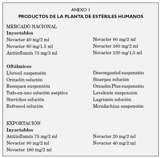 Andrés le presentó a Natalia una lista de los productos que fabrica la planta de estériles, dividida en los inyectables en ampolla y los oftálmicos (ver Anexo 1).