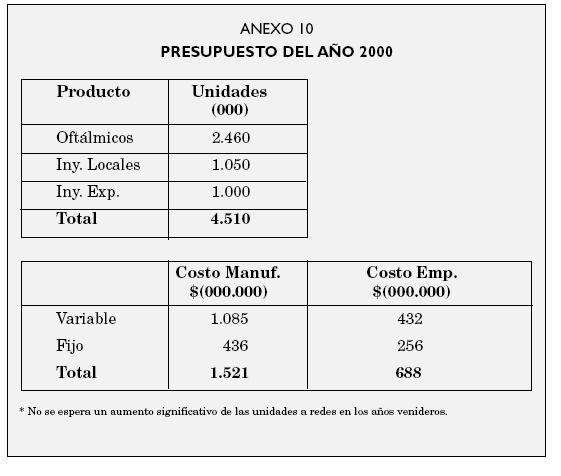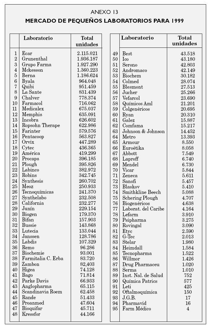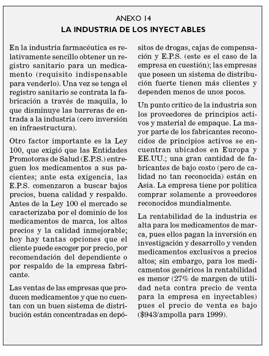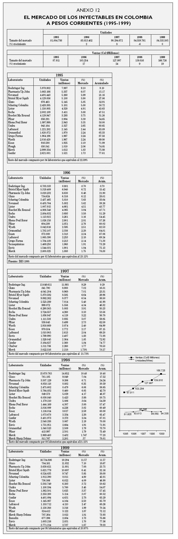 "Pues la verdad es que la planta no estaba preparada para una situación como ésta, así que no se había investigado más; sin embargo, ya se preparó un estudio del mercado de inyectables desde 1995 hasta 1999, del cual se puede concluir que éste en Colombia es altamente fraccionado pues existen más de un centenar de laboratorios que abastecen el mercado. Boehringer Ing. es el líder del mercado con un 11.57% de participación que ha venido incrementando poco a poco" (ver Anexo 12). "Ya sé qué me vas a decir, así que corrige las cifras para que queden a pesos constantes. Bueno, por otra parte, nuestra empresa está ubicada entre los laboratorios pequeños que producen menos de quinientas mil unidades al año en el mercado nacional de inyectables. Para 1999, fuera de los veinte laboratorios más grandes en el país, existen noventa y cinco laboratorios que venden productos inyectables y corresponden al 20.97% de todo el mercado. Las áreas estériles de estos laboratorios aún no han sido aprobadas por el Invima y según las exigencias muy pocos van a ser certificados. Para 1999 estos noventa y cinco laboratorios vendieron un promedio de doscientas cuarenta mil unidades al año, cantidad muy pequeña para justificar el montaje de un área estéril" (ver Anexo 13).