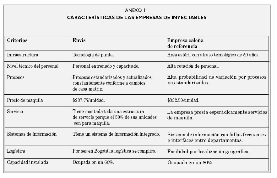 "Se llevó a cabo una comparación de Envis, localizado en Bogotá, y otro laboratorio caleño -que eran los dos aprobados por Aseguramiento de Calidad al momento de la necesidad-, con base en factores tales como costo, servicio, localización geográfica, etc."; le mostró la tabla comparativa (ver Anexo 11). "Por su parte los oftálmicos sufrieron un atraso de veinte días, pues la casa representada es muy celosa con sus procedimientos de manufactura y no nos permite entregar la manufactura de sus productos a planta alguna".