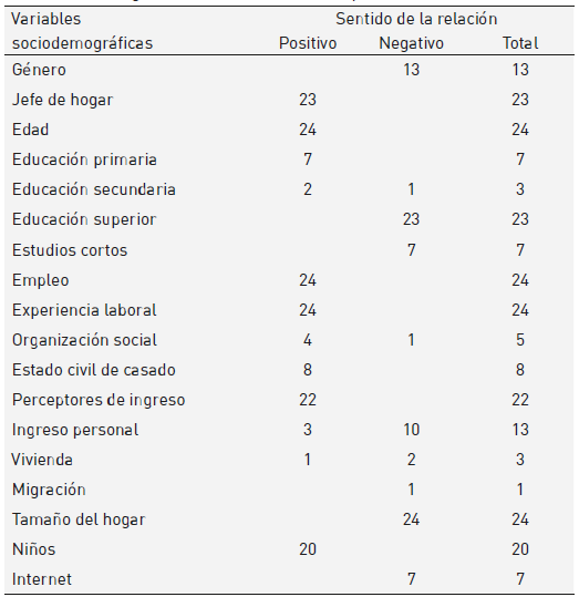En estos estudios de corte econométrico, las características sociodemográficas que se destacan son básicamente: la edad, la educación alcanzada, el nivel de ingreso personal, el estado civil, el número de miembros del hogar, la condición laboral, el género, entre otros. Sin embargo, el sentido de la relación causal encontrada no es homogénea, por ejemplo, una determinada variable, en algunos estudios muestra una relación positiva; en tanto que en otros, un sentido negativo, tal como se reseñará en el apartado de revisión de la literatura.