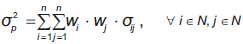 En (2) el parámetro σ ij representa la covarianza entre los rendimientos de los activos i y j, σ 2 p corresponde a la varianza del portafolio, n denota el número de activos disponibles y, w i y w j indican la proporción del portafolio a invertir en los activos i y j, respectivamente.
