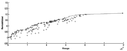 En la figura 1, donde el eje vertical representa la rentabilidad y el horizontal el riesgo, cada solución obtenida se muestra como un punto en el plano. Para el caso particular, la frontera eficiente está dada por las cruces que están unidas por la línea recta, las cuales dominan el resto de soluciones o puntos.