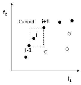 En los algoritmos genéticos, así como en otros metaheurísticos, es común medir la aptitud de un individuo usando la función objetivo. Sin embargo, dado que el problema en estudio es de carácter multiobjetivo, el NSGA-II usa una función que asigna la aptitud de acuerdo al nivel de dominancia o ranking (líneas 3 y 13). En otras palabras, se clasifican progresivamente los individuos en fronteras eficientes con ranking k si solo son dominados por individuos pertenecientes a fronteras con ranking menor a k. En la figura 3 se presenta un ejemplo en el cual los puntos rellenos corresponderían a los individuos con ranking 1, mientras que los otros tres individuos tendrían ranking 2. Otra característica especial del NSGA-II es el uso de la denominada crowding function o función de hacinamiento para la actualización de la población (línea 14). Dicha función consiste en ordenar de mayor a menor las soluciones con el mismo ranking de acuerdo a la distancia que existe entre dichas soluciones y las dos soluciones adyacentes con igual ranking con el fin de favorecer la diversidad de soluciones. Para estimar el hacinamiento o densidad de soluciones alrededor de una solución particular en la población, se calcula la distancia promedio entre los dos puntos más cercanos hacia cada uno de los objetivos. Este valor sirve como estimación del perímetro de un rectángulo formado usando los puntos vecinos más cercanos como vértices. En la figura 3, la distancia de hacinamiento para la i-ésima solución en su frontera (marcada con círculos rellenos) es la longitud promedio de los lados del rectángulo mostrado con líneas punteadas.