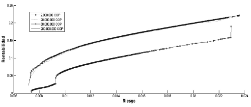En la figura 4 se presentan las fronteras eficientes para los presupuestos previamente mencionados. Las soluciones que aparecen como cuadrados unidos por una línea representan la frontera eficiente cuando el presupuesto a invertir es 2.000.000 COP. Se observa que esta frontera eficiente está muy por debajo de las otras 3 (línea punteada, línea unida por círculos y línea continua), las cuales no presentan una diferencia significativa entre ellas y se ven a simple vista como una sola línea ya que están superpuestas. Esto se explica principalmente por el impacto que tienen los costos de transacción en inversiones de montos bajos.