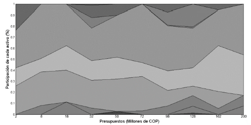 En la figura 6 se presenta la composición del portafolio que minimiza el coeficiente de variación. A medida que aumenta el presupuesto, la proporción invertida entre dos de las acciones (ISAGEN y CORFICOLCF) va variando hasta incluir una tercera y cuarta (CEMARG y CNEC) con los presupuestos más altos. Al igual que en el caso anterior, no hay diferencias significativas en el número de acciones, representadas por las diferentes tonalidades de gris.