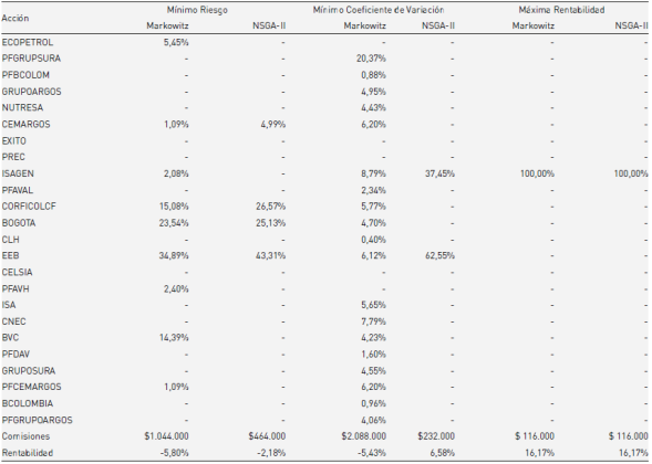 En esta sección se busca analizar el impacto de los costos de transacción en las soluciones, número de activos y valores de la función objetivo. Para esto se comparan los resultados del algoritmo propuesto contra los portafolios obtenidos a partir del modelo clásico de Markowitz. Dicha comparación se presenta en la tabla 2, en donde se contrastan los portafolios de mínimo riesgo, de mínimo coeficiente de variación y de máxima rentabilidad de cada uno de los métodos, para una inversión en la BVC de 10.000.000 COP. Los portafolios se construyen con datos del segundo semestre de 2015 y son evaluados en el primer semestre de 2016.