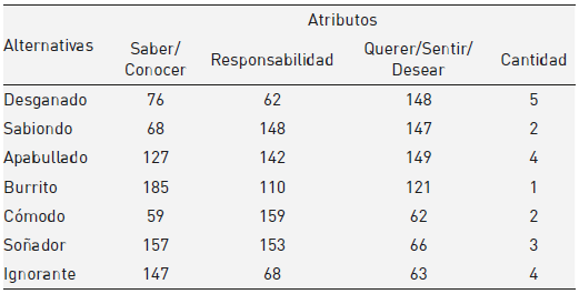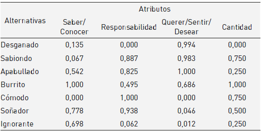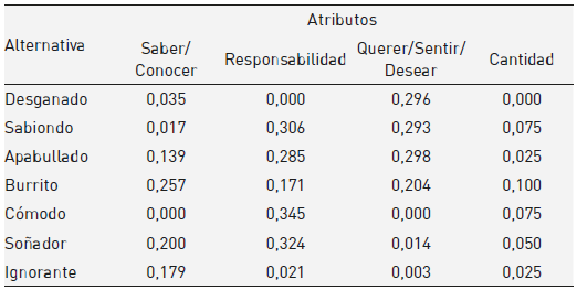 | Saber /Conocer | Responsabilidad | Querer /Sentir/ Desear | Cantidad | Valores (media geométrica) | Pesos (W) | |