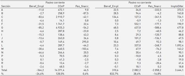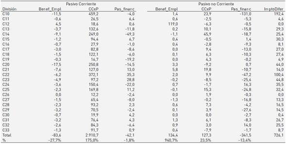 Las cuentas comerciales por pagar (CCxP), tanto corrientes como no corrientes, presentan incrementos. Los beneficios a empleados presentan un incremento en los pasivos no corrientes, mientras que en los corrientes se disminuyen. Los ajustes a los pasivos financieros de largo plazo presentan un efecto negativo de $2,10 billones de pesos colombianos, que representa una disminución en 16,8%, comportamiento que la SS (2015) ha señalado en su informe parcial. Los pasivos por impuesto diferido reconocidos por las Pyme en el proceso de convergencia contable alcanzaron un valor de $3,64 billones de pesos colombianos. Se destaca que las secciones L, actividades inmobiliarias, y C, industria manufacturera, son las que mayores valores aportan a este rubro. El componente no corriente del pasivo se incrementó en $4,1 billones de pesos colombianos (tabla 4), cifra cercana a la reportada en el reconocimiento de los pasivos por impuestos diferidos.