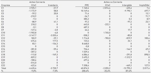 Como punto de partida informativo se debe indicar que de la muestra inicial se excluyeron 8 empresas pertenecientes a la sección C. Estas, bajo PCGA, representaban el 0,2% y 0,3% de los activos y patrimonio para toda la sección, mientras que en el ESFA tendrían una participación de 58,6% y 64,9%, respectivamente. Lo anterior, daría un sesgo positivo significativo a los resultados del proceso de convergencia en términos generales. Esto no significa que las variaciones presentadas en esas 8 empresas no sean válidas.