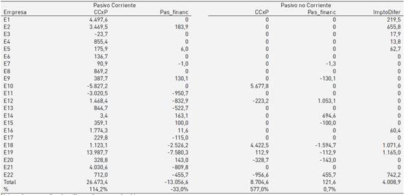 Benef_Empl: beneficios a empleados; CCxP: cuentas comerciales por pagar: Pas_financ: pasivos financieros; ImptoDifer: impuesto diferido.