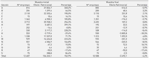 El no considerar las empresas con altos incrementos en su patrimonio en el ESFA, permite explicar que dos empresas, caso de las secciones H y J, son las que conllevan a los resultados de la muestra inicial, mientras que para las secciones A, B, C, M y N, el número de empresas responsable del efecto es menor a diez. En adelante se expondrán los resultados solo para la muestra final.