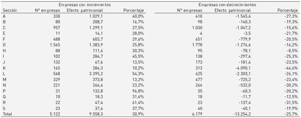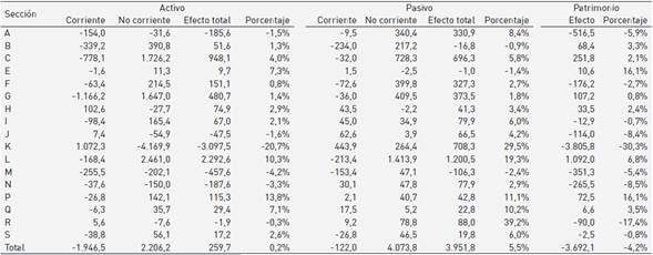Para la muestra final obtenida, el efecto general sobre el patrimonio es negativo en un valor de $3,69 billones de pesos colombianos, equivalente a un decrecimiento de 4,2%, resultado que concuerda en su naturaleza con los señalados por la SS (2012) y SS (2015). Es de anotar que 9 de las 17 secciones presentan decrecimientos, mientras que 8 presentan crecimientos. Las secciones K, actividades financieras y de seguros, y A, agricultura, presentan los mayores impactos cuantitativos negativos; mientras que la sección L, actividades inmobiliarias, y C, industria manufacturera, poseen los más altos impactos positivos en los resultados obtenidos.