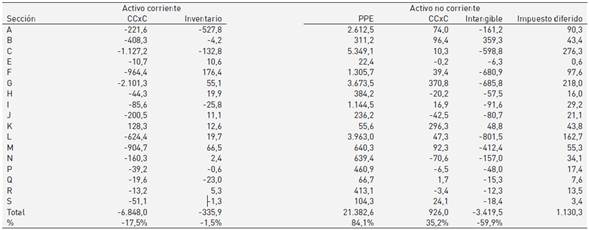 Para el caso del activo corriente, las CCxC y el inventario presentaron impactos negativos por montos de $6,85 y $0,34 billones de pesos colombianos, equivalentes a variaciones del -17,5% y -1,5%, respectivamente. El inventario para 7 de las 17 secciones presenta un efecto negativo, destacándose que las secciones A y C son las que aportan las mayores variaciones cuantitativas negativa. Para la cuenta del inventario, las secciones F, M y G presentan los efectos cuantitativos positivos más altos. En el caso de las CCxC, la variación negativa de las secciones G, C, F, M, L y B determina el efecto descendente de esta cuenta en general. Estas variaciones negativas en estas cuentas son suavizadas por el comportamiento de otros componentes del activo corriente, alcanzándose la variación global señalada en la tabla 4.