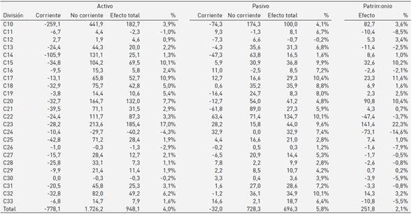 Retomando el análisis, la tabla 8 muestra que el efecto patrimonial para los entes económicos de la industria manufacturera alcanzó un monto de $0,25 billones de pesos colombianos, incrementándose el patrimonio en un 2,1%; a pesar que 11 de las 24 divisiones presentan un efecto negativo. Las divisiones C23, C20, C10, C15 y C17 poseen los aportes cuantitativos positivos mayores al impacto patrimonial; mientras que los cambios significativos en sentido negativo lo exponen las divisiones C24, C22 y C13.