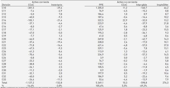 El incremento en los activos de las Pyme manufactureras, correspondiente a $0,95 billones de pesos colombianos, representa un 4,0%, el cual se ve conciliado en una buena parte en el incremento de los pasivos en un monto de $0,70 billones de pesos colombianos, un 5,8%. Se debe tener presente que 19 de las 24 divisiones poseen efecto positivo en el activo, siendo las divisiones C23, C10, C20, C22 y C15 las que presentan las mayores variaciones cuantitativas positivas. Los componentes corrientes del activo y del pasivo presentan variaciones negativas, mientras que los no corrientes presentan incrementos. El efecto general sobre el activo corriente fue negativo, con un valor de -$0,78 billones de pesos colombianos, un decrecimiento del 6,0%, mientras que el activo no corriente presentó un incremento en $1,73 billones de pesos colombianos, correspondiente a un crecimiento del 15,6%.