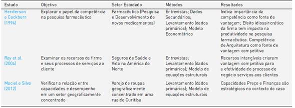 Os estudos, de uma maneira geral, apontaram resultados que indicam a importância dos efeitos da firma, ou seja, a especificidade de cada firma determina a competição entre elas, o que suporta a lógica da RBV. A tabela 1 resume tais achados. Além disso, os estudos consideram apenas um setor de atividade (ou indústria) específica, investigando as competências que exercem efeito positivo nos desempenhos observados, o que pode revelar um caráter contingencial ou contextual das estratégias adotadas.
