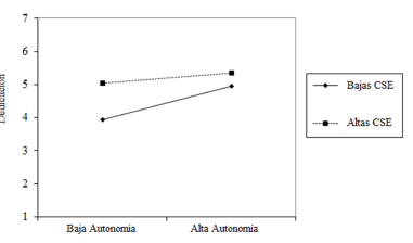 Figura 1 Efectos interactivos de las CSE en la relación entre autonomía y dedicación