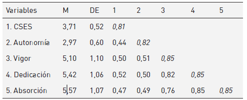 La tabla 1 reporta las medias, desviaciones estándar, correlaciones y niveles de consistencia interna para las cinco escalas incluidas en este estudio. De manera consistente con lo esperado, las tres sub-escalas del work engagement exhibieron correlaciones positivas y elevadas entre sí, oscilando las mismas entre 0,76 y 0,85, fenómeno que ha sido observado reiteradamente en investigaciones previas (e.g., Alarcon y Lyons, 2011; Pujol-Cols y Arraigada, 2018). Por otro lado, en la tabla 1 también se puede observar que tanto las CSE como la autonomía se correlacionaron de mane ra moderada y positiva con las tres dimensiones del work engagement.