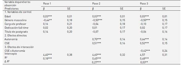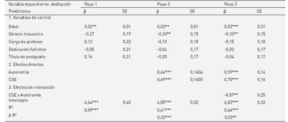 Tabla 3 Efectos de las CSE en la relación entre autonomía y dedicación