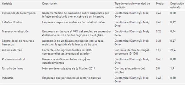 (evaluación de desempeño), cinco variables explicativas y dos variables de control. En relación con las variables explicativas, caben las siguientes menciones. En primer lugar, se toma el impacto diferencial de las empresas de origen estadounidense respecto del resto (principalmente europeas), teniendo en cuenta que presentan una mayor tendencia a la implementación de estrategias de individualización salarial. Para operacionalizar el grado de transnacionalización de las empresas, se utiliza una variable dicotómica que adopta el valor 1 cuando la empresa posee 40% de empleados distribuidos en al menos tres regiones mundiales diferentes (empresa transnacionalizada), y 0 cuando las empresas tienen 40% en dos regiones o bien 60% en una sola región (empresa regional). El indicador dicotómico de la variable explicativa estrategia de recursos humanos fue construido tomando como referencia dos variables. La primera de ellas se refería a si en la filial local el área de recursos humanos se encontraba integrada a un nivel superior o bien estaba separada, y la otra establecía el nivel de autonomía de la filial sobre la contratación de personal en tres categorías: alta, media y baja. Al respecto, se consideró que había “control local” en recursos humanos cuando el área de recursos humanos se encontraba separada de un nivel superior, mientras que el resto de las combinaciones se consideraron como integradas o con un mayor control por parte de la matriz. La variable Dummy de presencia sindical adopta el valor 1 si hay presencia en todos los establecimientos o en algunos establecimientos, y toma como valor base la presencia nula. En este sentido, se tomó la idea de presencia sindical y no de fuerza sindical, ya que solo se observaba la existencia o no de delegados sindicales en los espacios de trabajo y no se tomó en consideración el nivel de afiliación que existe, otro elemento que se considera en torno a la fuerza de los sindicatos.