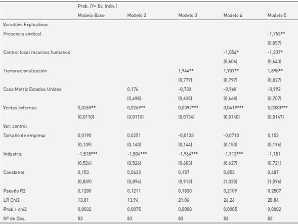 A partir del modelo base, el modelo 2 incorpora la variable explicativa que captura el impacto de ser empresa estadounidense sobre la implementación de evaluación de desempeño individualizante. El tercer modelo agrega la variable grado de transnacionalización, que captura el efecto de superar el mercado regional. El modelo 4 añade el efecto de las estrategias de recursos humanos. Finalmente, el quinto modelo suma el impacto de la presencia sindical, como variable dicotómica que toma el valor 1 para presencia sindical alta. Las estimaciones de los modelos se presentan en la tabla 2, en la que los valores asociados a las variables explicativas representan los coeficientes que explican la variación en el logaritmo de la razón entre la probabilidad de ocurrencia del evento y la probabilidad opuesta, ante cambios unitarios en las variables independientes; en paréntesis, debajo de cada coeficiente, se presenta la desviación estándar de cada variable.