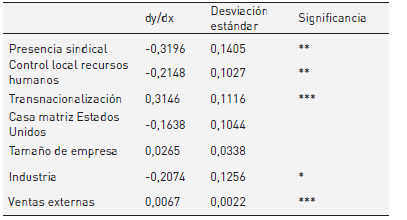 De las variables con un efecto positivo sobre la probabilidad de ocurrencia del evento en las empresas, el grado de transnacionalización de la empresa y la diversificación de las ventas con orientación exportadora, tienen un efecto significativo. Ser una empresa transnacionalizada es el factor que más incide en la probabilidad de implementar pagos individualizantes, con un incremento promedio de 32%. En cambio, la diversificación de las ventas hacia destinos externos, no aumenta sustancialmente la probabilidad de implementar esquemas de pagos variables (0,3%). De manera opuesta, en el caso de las variables que inciden negativamente en la probabilidad de implementación de PPR, los mayores efectos marginales corresponden a la presencia sindical, seguida por la estrategia de recursos humanos y el sector industrial. La presencia sindical genera un descenso promedio de casi 32% en la probabilidad de implementación de sistemas de evaluación individuali zante, mientras que los establecimientos con autonomía en el manejo de la política de recursos humanos generan en promedio una contracción del 21% en la probabilidad de aplicación de esquemas de evaluación individualizante. Las empresas que pertenecen al sector industrial tienen, en promedio, casi un 21% menos de probabilidad de implementar pagos variables. Finalmente, el tamaño de la empresa en Argentina y si la empresa es de origen estadounidense no tienen efectos marginales significativos sobre la probabilidad de ocurrencia del evento.