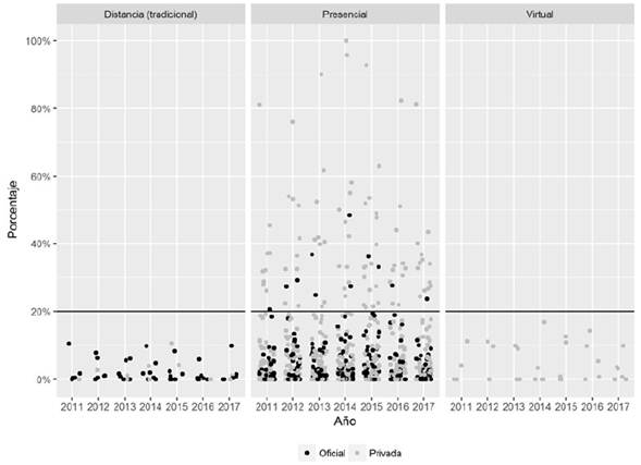 Para finalizar, se presenta la proporción de clasificados en B+ por programa de Administración y mod alidad del programa (a distancia, presencial y virtual) entre 2011- 2017 (figura 1). Los programas se agrupan de acuerdo a la modalidad y el color diferencia entre las instituciones oficiales (en negro) y privadas (en gris).