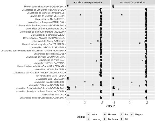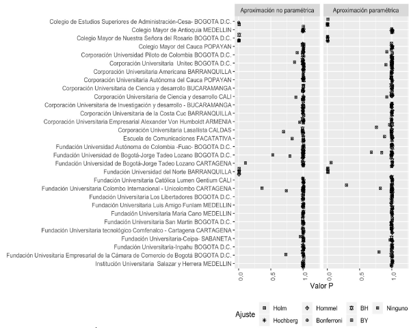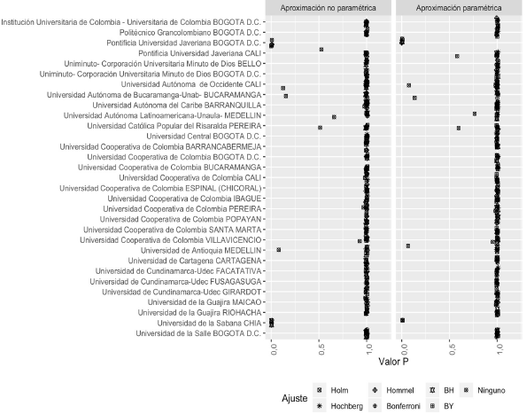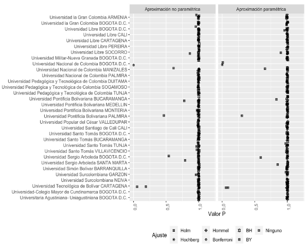 Dado que se desea determinar simultáneamente si cada uno de los programas de Administración cumplieron con la meta o no, se ajustan los valores p, empleando las aproximaciones sugeridas por Holm (1979), Hochberg (1988), Hommel (1988), Benjamin y Hochberg (1995), Yekutieli y Benjamini (1999) y Bonferroni (1936), para evitar obtener una conclusión conjunta a partir de unir los resultados de pruebas de diferencia de proporciones individuales.