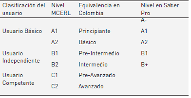 Para poder medir los alcances logrados en materia de bilingüismo en el país, el Instituto Colombiano para la Evaluación de la Educación (ICFES) incorporó, desde el año 2007 en la prueba Saber Pro, un componente de inglés armonizado con el Marco Común Europeo de Referencia para las Lenguas (MCERL). El MCERL es una guía estandarizada que sirve para medir el grado de desarrollo de la competencia de quienes aprenden nuevos idiomas (tabla 1). Como se observa en la tabla 1, para las pruebas Saber Pro, se agregó el nivel de desempeño A- que no se encuentra en el MCERL y que corresponde a aquellos que no alcanzan el nivel de principiante.