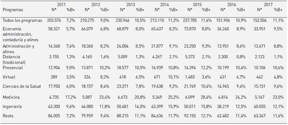 Tabla 2 Número de estudiantes evaluados (N*) y porcentaje de estudiantes en nivel intermedio o superior (%B+) de acuerdo a la prueba Saber Pro por área del conocimiento (2011-2017)