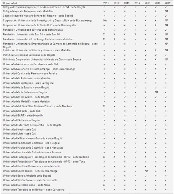 NA: o la IES no presentó estudiantes de Administración para ese año a la prueba Saber Pro o presentó solo uno. Las IES están ordenadas alfabéticamente.