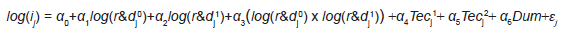 donde r&d es la inversión por trabajador realizada por las empresas en proyectos de investigación y desarrollo tecnológico (IDT); los superíndices 0 y 1 denotan, respectivamente, inversión intramuros y extramuros; la variable Tec representa el porcentaje de empresas que realizan actividad tecnológica, los superíndices 1 y 2 denotan, respectivamente, a las empresas que desarrollan tecnología una vez al año y entre 2 y 5 veces al año; la variable Dum toma valores de 1 si el sector j se encuentra en el cuartil 1 de menor inversión en innovación por trabajador y 0 en cualquier otro caso. Por último, ε es el término de error aleatorio de la ecuación.
