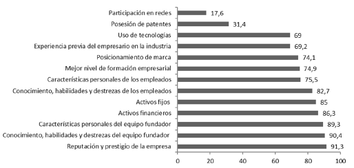 Estudios empíricos llevados a cabo por Chatzoglou, Chatzoudes, Sarigiannidis y Theriou (2018), Kamasak (2017) y Haji y Ghazali (2018) permiten confirmar la importancia de los factores internos (propios de la empresa) en el desempeño de las empresas. En esta investigación, la reputación y el prestigio de la empresa (91%), seguido por el conocimiento, habilidades, destrezas (90%) y características personales del equipo fundador (89%) (figura 10), son los factores internos que los empresarios consideran como los de mayor relevancia. Según Soini y Veseli (2011), el conocimiento del negocio por parte del fundador tiene un impacto en su crecimiento, y las habilidades de gestión, el conocimiento y la experiencia previa también contribuyen al rendimiento y crecimiento de la empresa. Adicionalmente, Rasmussen y Nielsen (2011) y Sidik (2012) evidencian que un nivel más alto de formación empresarial tiene un efecto positivo en la productividad, lo que posteriormente conduce a una mayor rentabilidad.