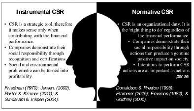 Precisely, the instrumental/normative debate of the CSR is guided by two different forms of logic (Figure 1). On the one hand, Instrumental CSR attempts to convince companies that acting in a socially responsible way contributes to superior financial performance. The fundamental concept is that social problems can be turned into profitable business opportunities and that business organizations can achieve superior financial returns by being socially responsible (Porter & Kramer, 2011). Normative CSR, in turn, takes a different approach and relies on a moral background, particularly inviting companies to do what is morally or ethically “right” in order to be aligned with sustainable development goals. Most scholars working in this field have been identified with universal and disinterested corporate responsibilities and practices that can be implemented by companies (Scherer & Palazzo, 2007).