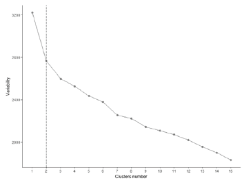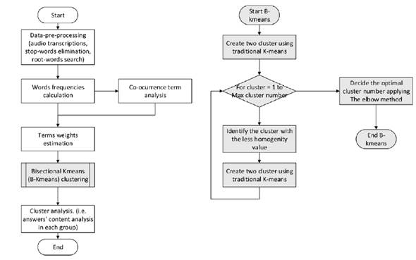 The current work uses a clustering technique known as bisecting k-means. This technique is characterized by forming clusters with hierarchical adjustment and, according to Karypis, Kumar and Steinbach (2000), combines the speed of calculation of k-means with the quality of the groupings of hierarchical clusters. For the development of such groupings by the application of the B-kmeans, it is necessary to begin from a single group that comprises all individuals (population group). Then, this population group is divided into two different subgroups (i.e., bisection) in such a way that the maximum similarity between their individuals is generated. Once these two subgroups are obtained, we select the cluster with the lowest degree of similarity; next, we divided it again creating two new subgroups. It is necessary to apply the bisection process to the new cluster with the lowest degree of similarity until getting the desired cluster quantity (taking into account the Elbow Method variability change).