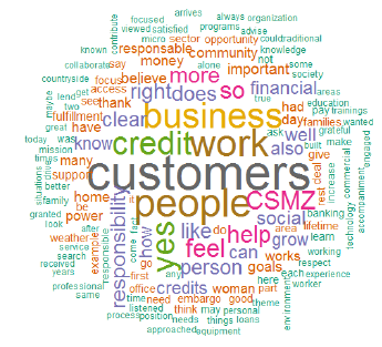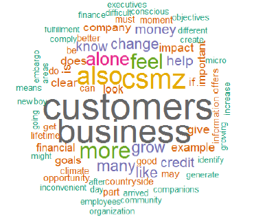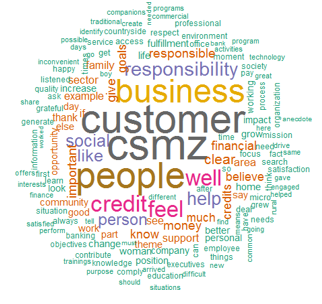 In addition to emphasizing a sort of genuine spirit of responsibility for CSMZ’s actions, responses focused more on dealing with customers, their vulnerable condition (typical of the Colombian rural environment), and the positive impact of the company’s actions on the quality of life and well-being of other stakeholders. Incidentally, among other related characteristics of this group’s members, the specificity of their educational condition is a common element to highlight. Interviewees expressed satisfaction with their career at the company and, at the same time, about being able to participate in training focused on personal care and work. This translates into a more pleasant working environment in which personal knowledge, development, and satisfaction for actions are shared; moreover, those actions are related to the positives experiences in many financing projects developed by CSMZS’ employees. As an example of the above, one of the employees that is part of this group highlights the following comment: “I like working for the company, I like the purpose of CSMZ, and identify with it. At the moment, I am in the Public Relations Department, and feel that I am able to live more closely to the company and be more aware of the social impact that it has for people with scarce resources.” Figure 7 presents the most used words in interviews.